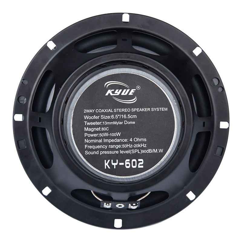 Model:KY-602 (6.5) 2way Speaker System Power:50-100w Tweeter :13mmMylar Dome Voice Coil:25.5mm Nominal Impedance Ohms :4 Magnet:60z Frequency Range:50Hz-20KHz Sensitivity:90db Material(cone):PP from Taiwan